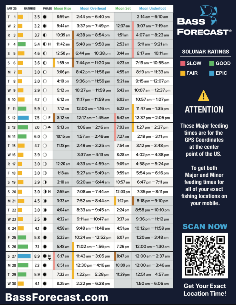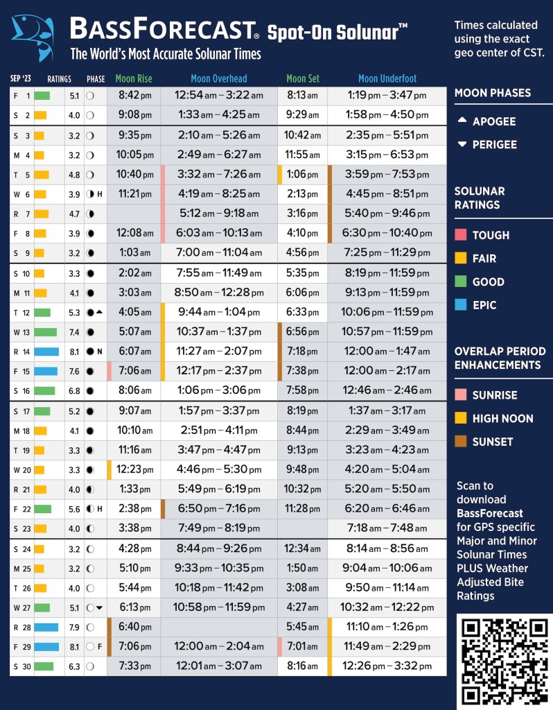 To assist anglers when it comes to planning fishing trips, we supply astro tables each month on Bassmaster.com. Lunar periods are enhanced when they overlap a key solar period. The best of these overlaps are designated by the sun symbols below. Enjoy our fishing calendars and discover the best fishing times each month. Tables provided by BassForecast.com.